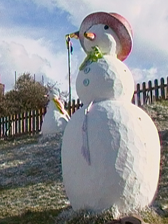 Fiz um enquadramento horizontal e mais fechado para sobressair e isolar o boneco de neve. É pena ainda se ver o poste agarrado à sua "orelha". Da próxima vez desloca-te até um poco para o lado até conseguires esconder o poste atrás do boneco.