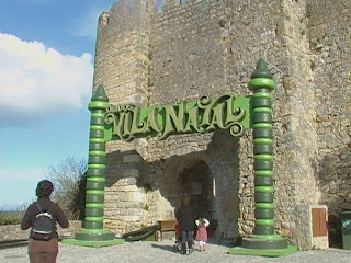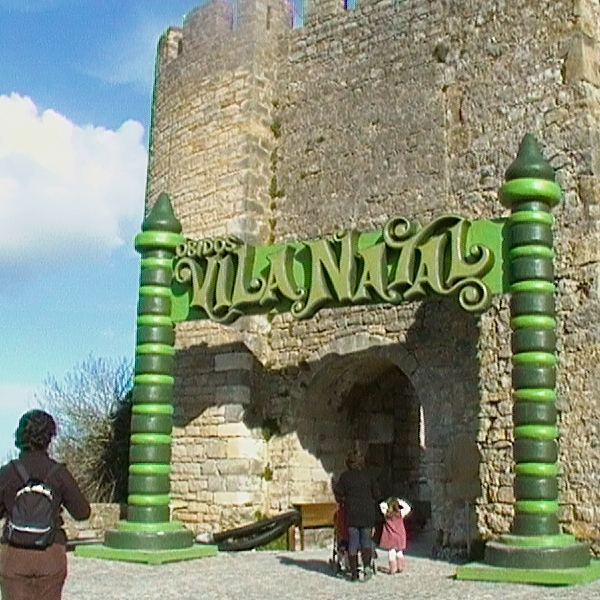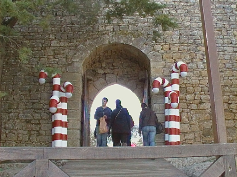 Neste registo da porta da muralha reenquadrei para tirar a barra de madeira que se encontra atravessada à direita e coloquei o centro do arco exactamente no centro da fotografia para houvesse um eixo de simetria. Ficou equilibrado com as bengalas gigantes de doce que se encontram de cada lado da porta. foi pena tere-se perdido a moldura natural que as árvores com os ramos verdes estavam a fazer à volta da entrada.